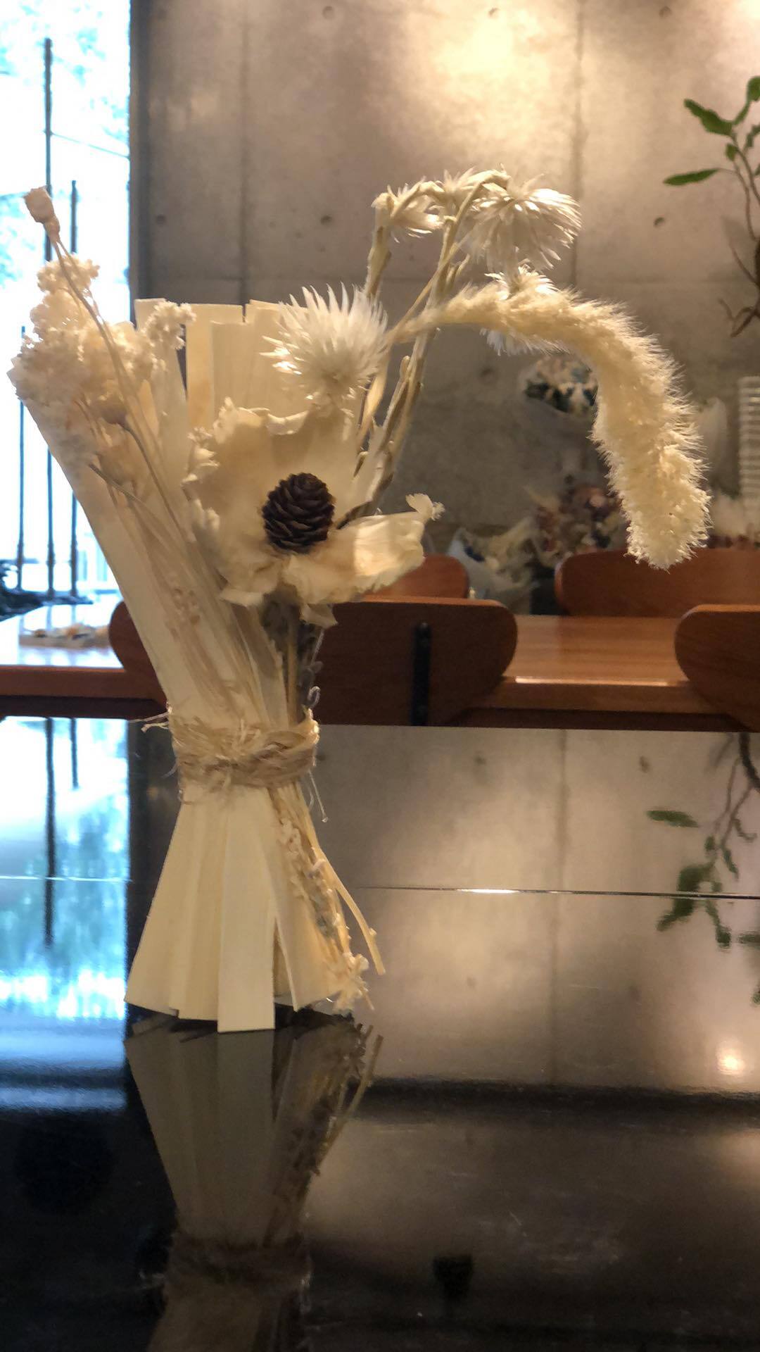 リボンのような白のラタンをドライフラワーと共に束ねた自立するブーケ。ナチュラルながら清楚な佇まいはウエディングのテーブルフラワー、ウエルカムコーナーの演出に。インテリアフラワーやギフトフラワーとしてもお勧めです。アロマの香り付き