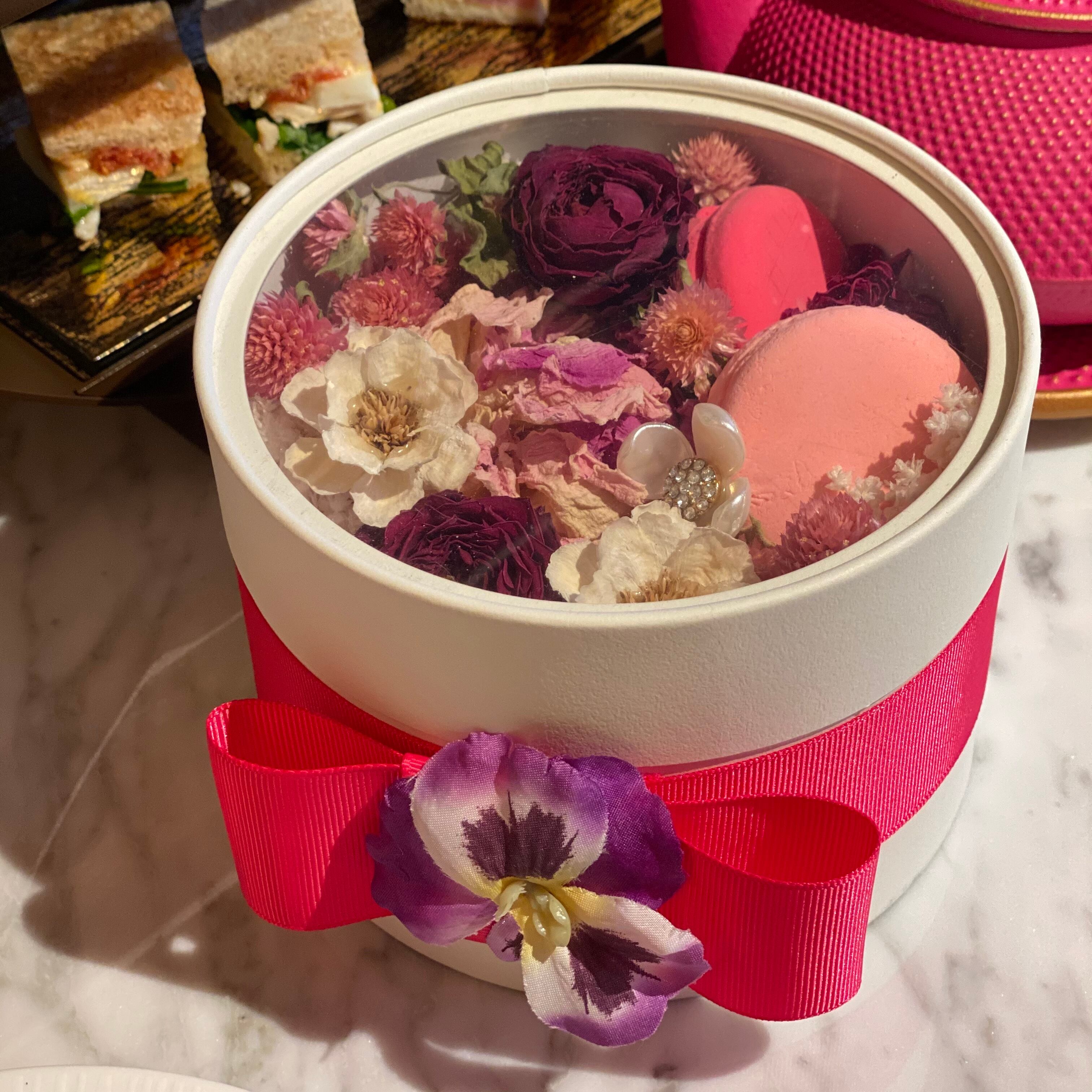 自家製ドライフラワーローズ、その他ドライフラワー、マカロンオブジェ(紙製)、サークルボックス、リボン